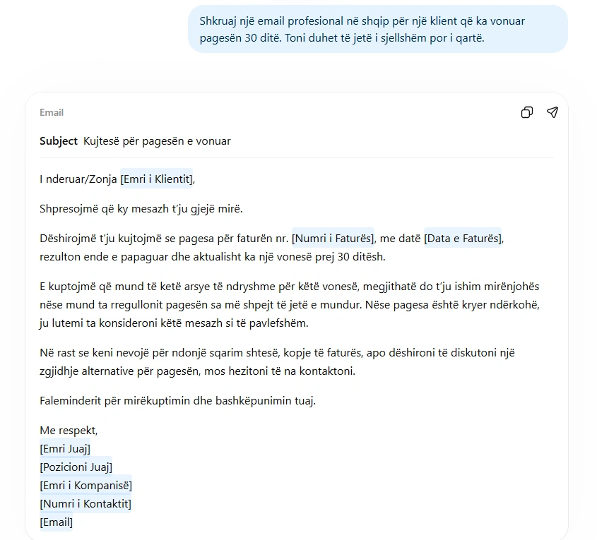 Prompt i mirë: “Shkruaj një email profesional në shqip për një klient që ka vonuar pagesën 30 ditë. Toni duhet të jetë i sjellshëm por i qartë.”