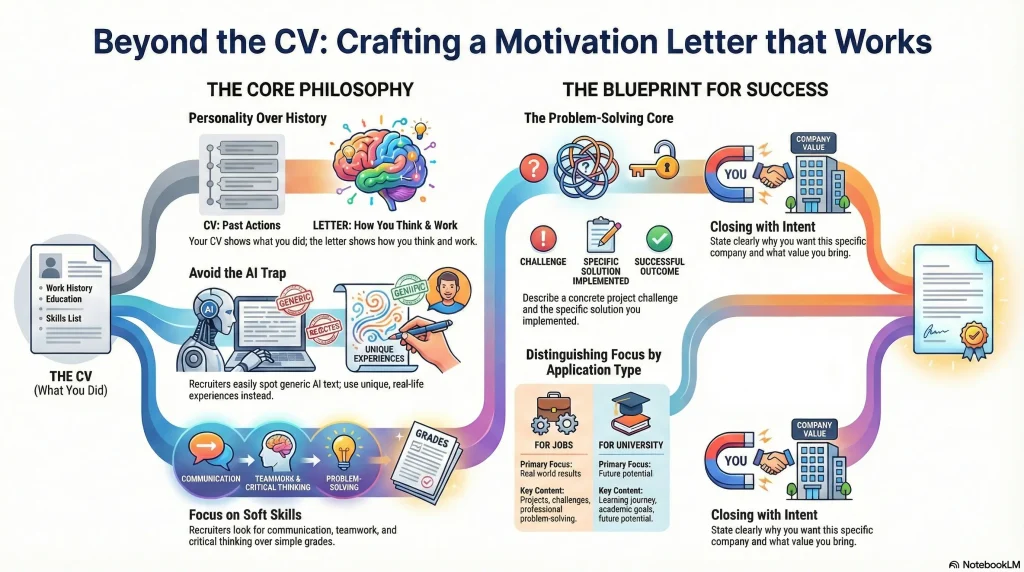 Letra e motivimit nuk është një formalitet. Është mundësia jote për të folur drejtpërdrejt me personin që po lexon aplikimin. Nëse e shkruan bazuar në veten tënde reale dhe jo në modele të gatshme, ajo bëhet një nga armët më të forta që ke në çdo aplikim.
